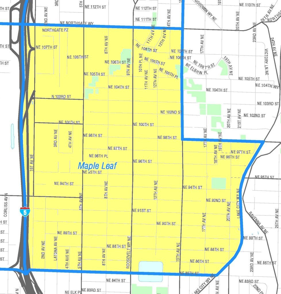 John is likely referring to either the City Clerk’s (unofficial) neighborhood map, which thinks Maple Leaf stops at 15th Avenue Northeast, OR the Maple Leaf Community Council’s map, which essentially cuts Maple Leaf off at Thornton Creek.