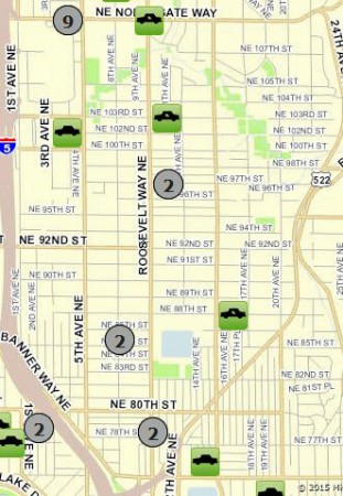 The Seattle Police crime map above shows six home burglaries so far this month in Maple Leaf. Most of them follow the pattern Christina described. (The gray circles are business burglaries, not homes.)