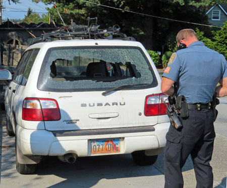 One shot clearly broke the back window of this Subaru Forester before embedding in the right rear seat.