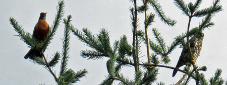 This young Merlin Sharp-shinned Hawk (right) is perched on a Douglas Fir high over Maple Leaf Life South.