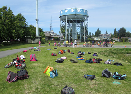The scene at the park at 2 p.m. today. Eighty-plus kids from The Perkins School (9005 Roosevelt Way N.E.) enjoy bike field day - “exercise plus safety”.”