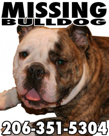 “The family which owns Deuce the bulldog, kidnapped from Crown Hill, still hasn’t found him and one of their largest flyers was torn down, from a pole by the Northgate library. That might indicate the dog is in the Northgate or Maple Leaf area.