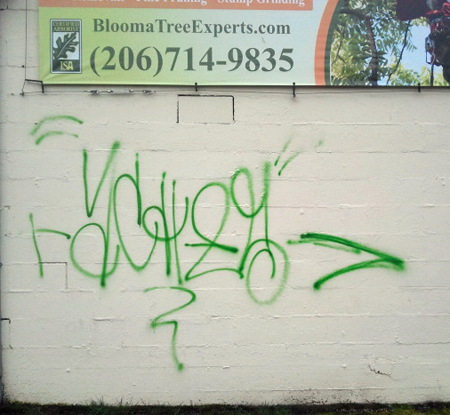 “The north side of our building was tagged last night. Green spray paint. Tried to report it on line but I don’t think the system took the report.