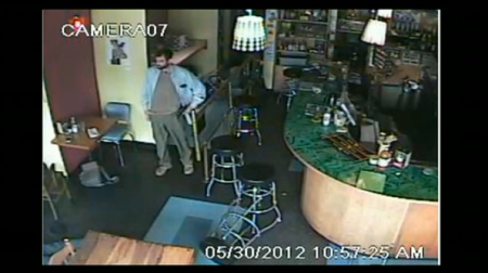 Update 3:20 p.m. Police have released a surveillance video photo from inside Cafe Racer. They describe the suspect as a white male, approximately 30 years old, wearing a dark short cap, with well-groomed dark hair, a neat full beard, wearing a light blue jacket. He is considered armed and dangerous.