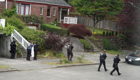 Police search for shooting suspect outside a Maple Leaf home in the vicinity of 15th Avenue Northeast and Northeast 85th Street. Photo courtesy of a neighbor who wishes to remain anonymous, but emailed: “The resident looked pretty scared when he answered the door. He left and was not a suspect.”