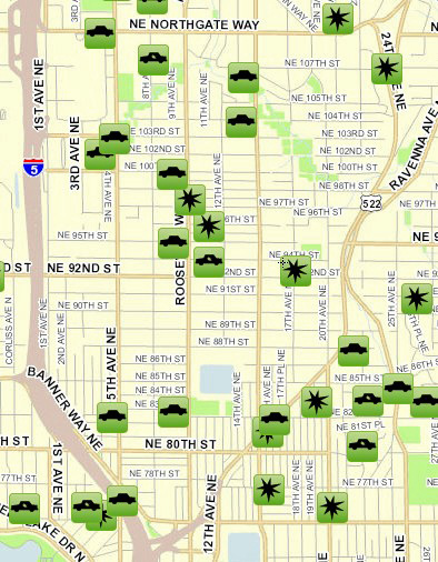 When we ran the Seattle Police crime map for the month of May, we found a half-dozen burglaries (stars on the map) and about 14 vehicles either stolen or prowled in Maple Leaf.