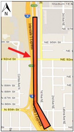 According to an alert sent today by Sound Transit, geo-tech drilling started yesterday and will continue for a few weeks near the future North Link light rail line, along Interstate 5 from about Northeast 84th Street north to where the light rail tunnel will exit at Northeast 97th Street.