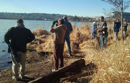 Now there’s a Tufted Duck (TUDU, to bird banders) at the Montlake Fill. And dozens of birders there watching him. (If you want to find him, look for the crowd.)