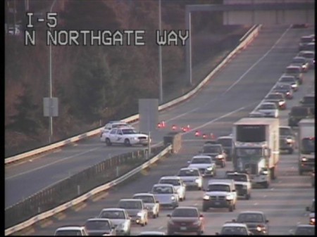 Police and the Washington State Patrol are reporting that all lanes of First Avenue Northeast are blocked (4:41 p.m.) near Northgate Mall by a police investigation and multiple car crash.