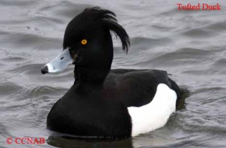 Very rare visitor from Eurasia, mostly along coast; records are of single birds on ponds or sheltered bays….Male distinctive: black back and rounded black head with long dangling tuft.