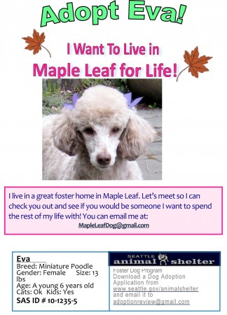 Eva is a 6-year-old miniature poodle, who has slightly impaired vision and is on medication to prevent seizures.