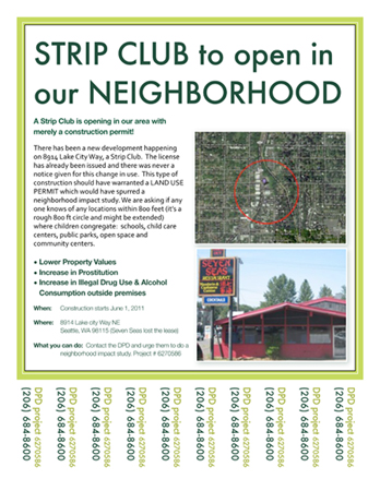 The former Seven Seas Restaurant, 8914 Lake City Way N.E., might soon become the newest bachelor party destination in the wake of Rick’s demise. According to a neighborhood flier (click to see a larger version), construction to turn the restaurant into a strip club will begin June 1.