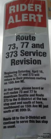 Our thanks to Mat, who in commenting on an earlier post was the first to note here that the bus service that moved to Roosevelt Way Northeast on Feb. 8, 2010, will return to 15th Avenue Northeast next Saturday.