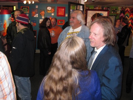 Owner Mark Hutchins, shown at front right, is hosting an opening reception tonight featuring the art of Northwest artist/musician/entrepreneur Rob Morgan. Don’t worry if you can’t make it tonight, though. Morgan’s “semi-legendary cartoon characters Ivan, George & their ever present bun warmer (aka ‘Two Katz & A Toaster’)” will be on display at the artistic frame store through May 14.
