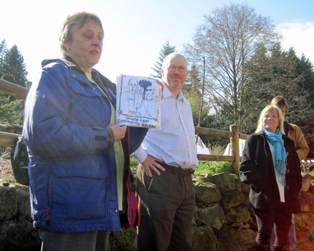 Barbara Maxwell, a Maple Leaf Community Council veteran, presents Mike McGinn with a Maple Leaf Community Garden T-shirt as Jenn Zanella looks on.