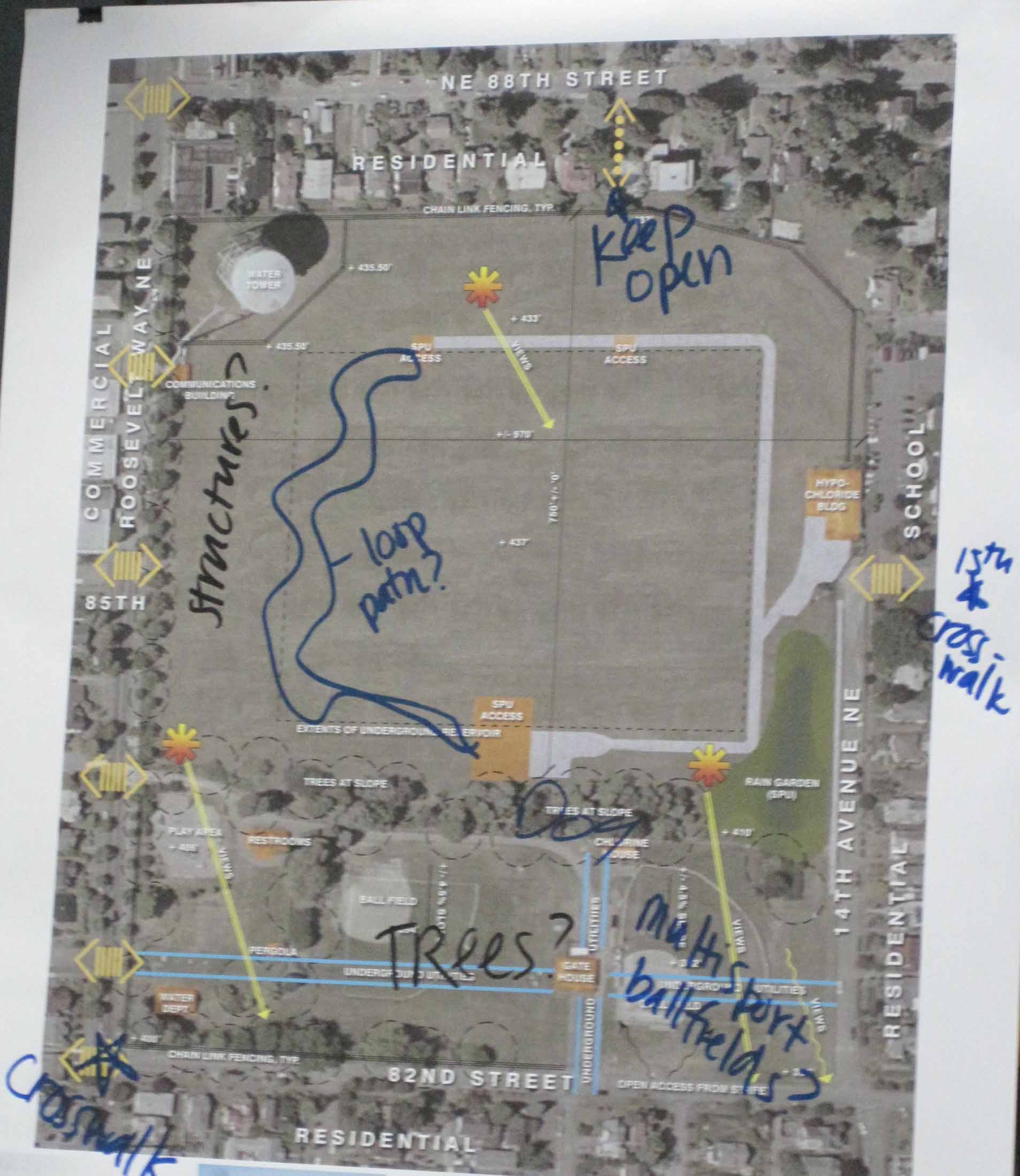 Print out your own copy of the Maple Leaf Park Plan the city is using to design the greatly expanded Maple Leaf Reservoir Park. (View full screen here). See how much of the wish lists from Tuesday night’s meeting you can fit!