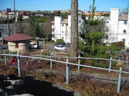 The garden features 22 P-Patch garden plots and open space for the community, including a meditative labyrinth at its peak and “Native Land,” which is planted with native shrubs that are a haven for birds as well as bird watchers.