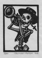 Halloween is more than a month away, but Fine Impressions Gallery is already preparing for the autumn months, announcing a visit from artist Sam Hamrick, whose linocut “Trumpet Player” is shown at right.