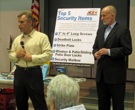 Mike Sanford, assistant police chief (left), and City Councilman Tim Burgess address almost 100 residents at Wednesday night’s meeting.