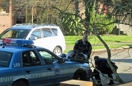 “The police searched and arrested this man near the corner of 90th and 12th, she wrote, and sent us this photo. “There are multiple patrol cars combing the area with some officers on foot looking for something.”