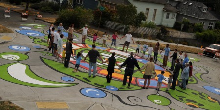 To move forward, the project needs the approval of 60 percent of Maple Leaf residents on the adjacent streets, according to the Seattle Department of Transportation. The street painting would be completed by Maple Leaf children and adult volunteers, with the help of Rachel Marcotte, the Maple Leaf artist behind this project and the Wallingford turtle painting, shown above.