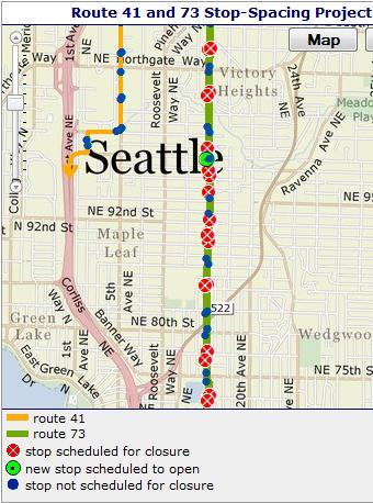 If we’re reading this right, Metro is planning to reduce the number of closely spaced bus stops on the Route 41 and 73 corridors in Maple Leaf by nearly a dozen this month when buses resume running on 15th Avenue Northeast.