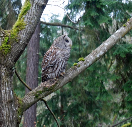 In our region, the Barred Owl can be found along steep-sloped ravines and bluffs with a mixed wood canopy. This species, which calls throughout the year, has bred for many years in the forests of Discovery Park and it can also be found at St. Edward State Park in nearby Kirkland.