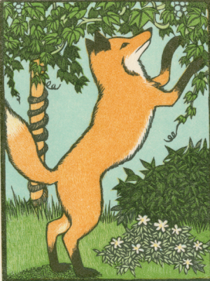 Featured on its home page and in its monthly newsletter are various prints both educational, such as the above “Bulbiferous Great Round-Headed Garlic” from Anne Pratt, and more literary, including the illustration at left by Sarah Chamberlain for the Aesop’s fable “The Fox and the Grapes.”