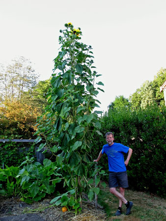 See attached photo of this amazingly tall sunflower in our yard! Is this what happens to plants when the sun finally comes out in Seattle???!!! My husband is 5′ 8″ for reference.