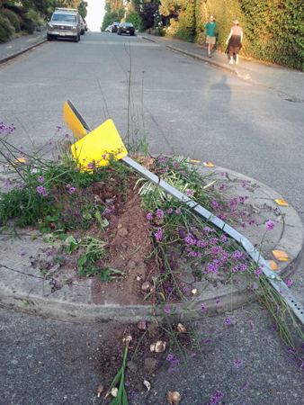 As the other “traffic circle steward” with my neighbor Karen, maybe a bit of history would be helpful in understanding our frustration. About 7-8 years ago, homeowners who lived near the traffic circle were contacted by SDOT asking for volunteers to take over the maintenance of the traffic circle at the intersection of 12th and 88th. The invitation, stated clearly that if nobody volunteered, it would be paved over. I find paved traffic circles unsightly; we don’t need more concrete and asphalt. My neighbor and I agreed to be the stewards and worked with the city to select plants that were appropriate for the unique size of our circle and in response to the slope and grade of NE 88th. We were given very explicit guidelines e.g. size, type and height of plantings, no trees, no fencing, no large rocks or items that would impede safety vehicles. We felt we were working in partnership with SDOT, but have found them not to be as committed or helpful as they initially were. I do think that traffic circles serve a purpose beyond speed control. A nicely planted and maintained circle actually causes many people to slow down to look and engages neighbors and other members of the community in conversation with the stewards when they are working together or individually on the circle. It also improves the look of our neighborhood and sends the message that we care about our community. The real issue is that the circle is prone to damage for the various reasons already cited i.e. speed, carelessness, poor visibility and vandalism. It is now time to think seriously about planting a tree that can be sustained by the circle parameters and allows for visibility of the reflector sign, but also screens the sun from drivers’ eyes when heading east or west. A tree with a high canopy is called for. This may not address the carelessness or vandalism issue, but it would make the circle more visible and perhaps easier to maintain and less prone to destruction.
