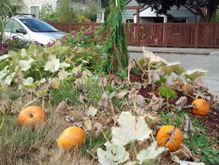 Ha! That’s our house. We hadn’t expected the pumpkins to take over like that, but it sure has been fun watching them grow. Lots of people stop and remark on the pumpkins or the old drain pipes, planted with scotch moss. It’s kind of fun. I wish we could do more with the REST of our yard, but we have a lot of work to do on this old house, so it’s slow going. The mulched corner and pumpkin patch reflects our intention, though. 🙂