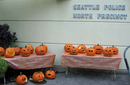 This afternoon Sgt. Dianne Newsom sent us this photo of pumpkins carved by Ingraham High School students and on display at the North Police Precinct.