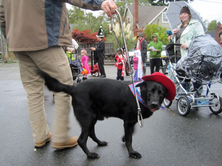 The parade that almost didn’t happen has over 100 kids, critters and adults marching through the neighborhood now.