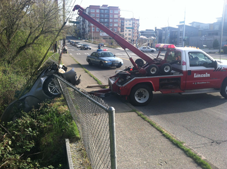 Two readers sent us information plus a photo from a car accident Sunday that sent a car careening into Thornton Creek from Fifth Avenue Northeast, near Northgate Mall.