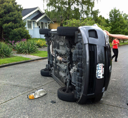 “Neighbors were on the scene within seconds; police within a couple of minutes, followed by fire trucks and aid vehicles,” emails Linda, who sent the photo above. The accident occurred just before 3 p.m.