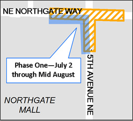 The removals, part of the Northgate Coordinated Transportation Investment Plan in a project called “NE Northgate Way & 5th Avenue NE Intersection and Pedestrian Improvements,” are coming from the south side of Northgate Way and from Fifth Avenue Northeast where they intersect.