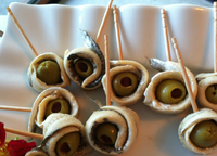 The evening started with sangria and Spanish hors d’oeuvres including manchego cheese, figs, cured meats, flatbread, and the anchovies and olives pictured at left, which the nearly 20 guests munched while watching Kristine add ingredient after ingredient to the paella she cooked right outside the door.