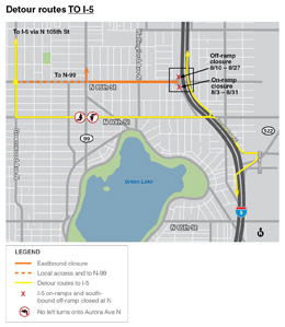 Drivers traveling on I-5 should use the NE 50th Street or N Northgate Way exits during the weekend closures. SDOT encourages drivers to continue following signed detour routes, plan ahead, expect delays, use alternate routes to and from I-5 and SR 99, and ride the bus, bike or walk when possible.