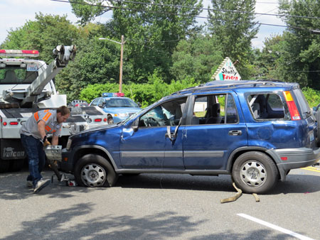 Amazingly, none of the people in the two cars involved were seriously injured. And neither was the large dog from this SUV, who was being fed dog treats by a police officer when we were there.