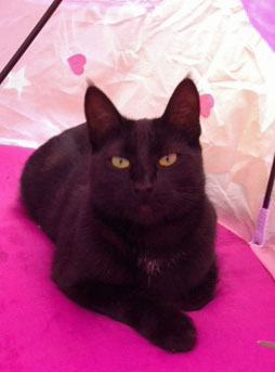“He is one year old, but looks younger because he is quite small. His name is Mortimer and he is all black with a very tiny white patch at his throat. He is extremely friendly.