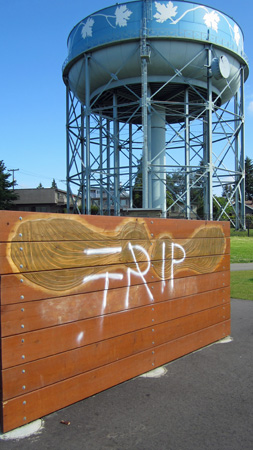 Seriously, are we surprised? This tag showed up on the side of the restrooms adjacent to the playground. This is a target begging to be tagged. If you want to be practical about surfaces in any public area they should be designed so that the graffiti patrol can cover them up quickly and efficiently. That means good old fashion concrete. Wood with a pretty design?