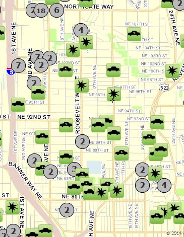 The map at right is of property crimes in the neighborhood since our last report in late April. Specifically, it shows home and commercial burglaries and car thefts/car prowls. (And possibly stolen bicycles, because we forgot to uncheck that box on the police crime map.)
