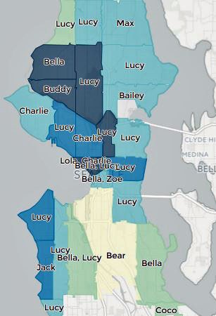 There are a total of 490 dogs named Lucy in the city, and that’s not including variants of the name, like Lucy Latte (could a dog name get any more Seattle?).