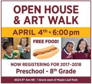 This evening is St. Catherine School’s Art Walk and Open House, starting at 6 p.m. at the school, 8524 Eighth Ave. N.E.